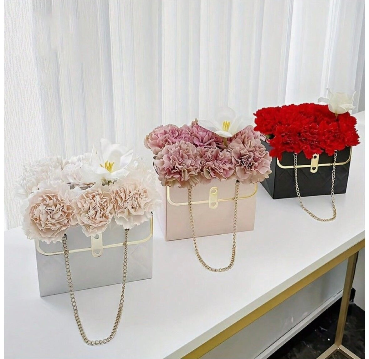 Large Floral Purse: is sure to be a hit for that special someone on your list who loves flowers and adorns purses. The Large Floral Purse is a delightful accessory that combines practicality with a vibrant aesthetic. Large Floral Purse is available in different colors and with assorted flowers with greenery and babies breath Perfect for Eid gift giving. Regular is with carnations, super is mixed flowers types, and deluxe is with roses. Large Floral Purse is a stylish and functional choice that brightens your wardrobe and enhances your look.