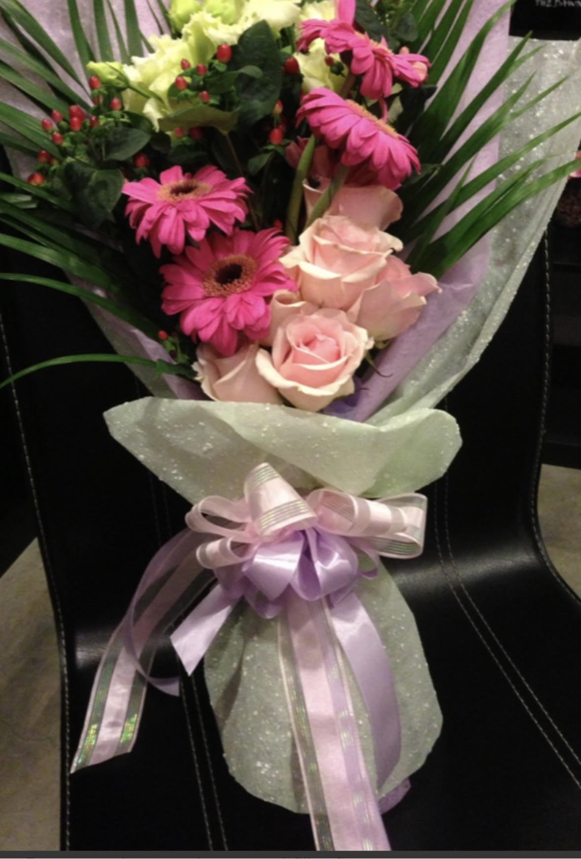 Mixture of gerberas, roses and alstromerias with lush greenery. Color and flowers will vary.