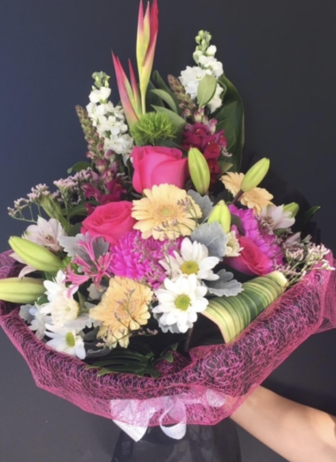 A mixture of flowers in a perfect bouquet and very elegantly wrapped in mesh.