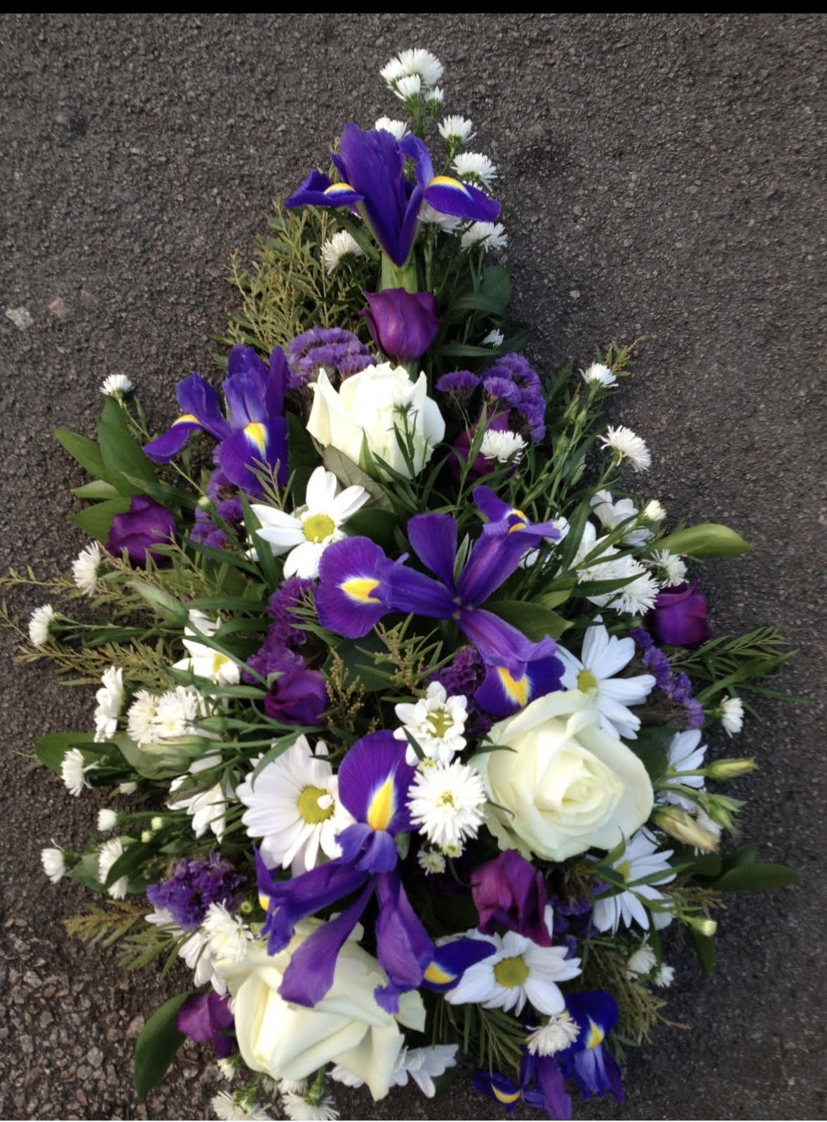 A tall, elegant floral display arranged on an easel, placed near the casket or at the front of the service. These sprays are often made with lilies, roses, and gladiolus, symbolizing respect and remembrance. This arrangement comes with purple irises.