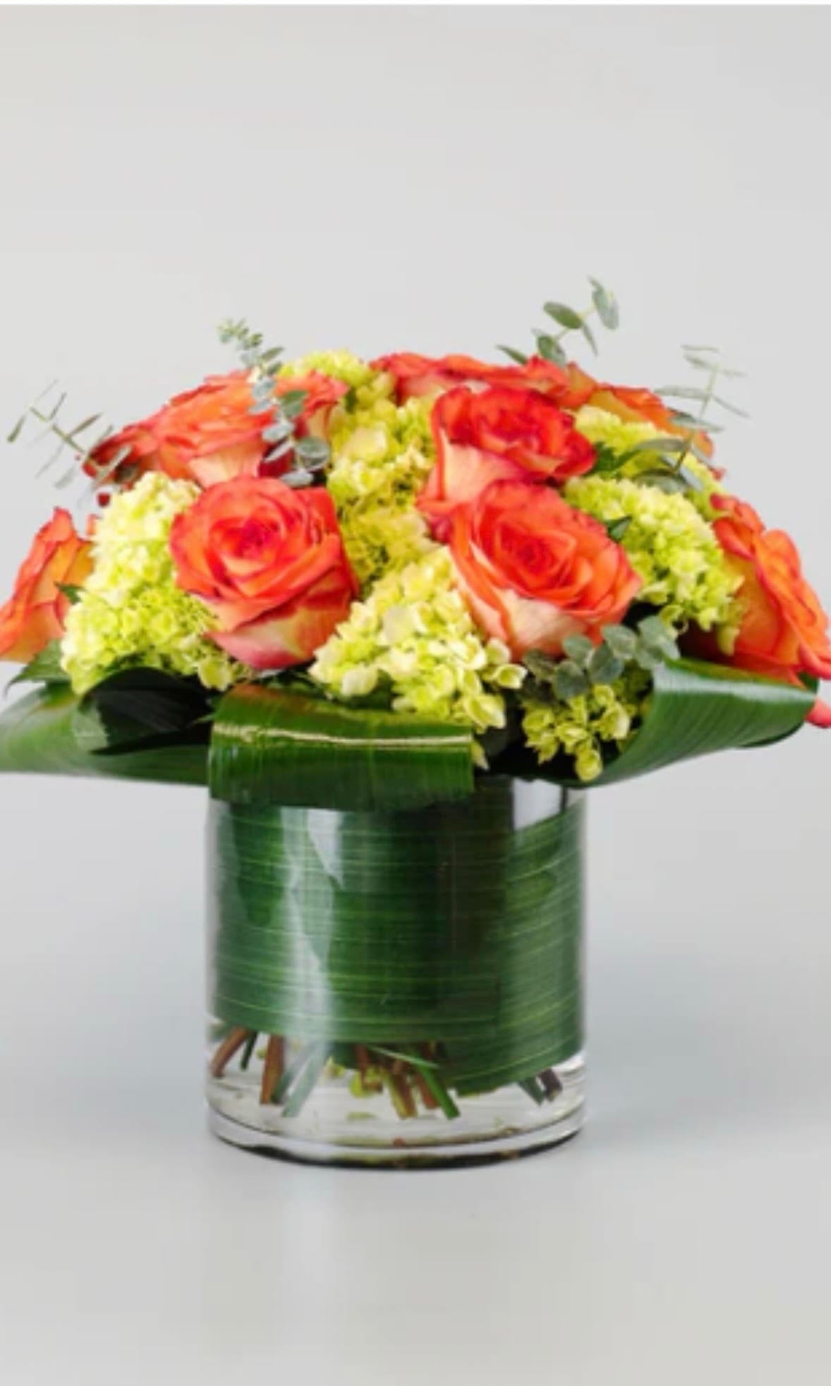 Rust coloured roses: green hydrangeas in greenery covered glass vase.
